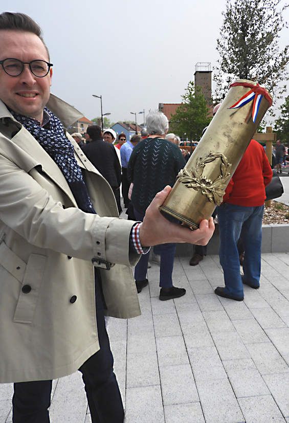 Notre livre "Alphonse Bray et sa famille" a été placé dans une magnifique douille d'obus pour être conservé à l'intérieur de la stèle accompagné d'un journal de la date d'aujourd'hui.